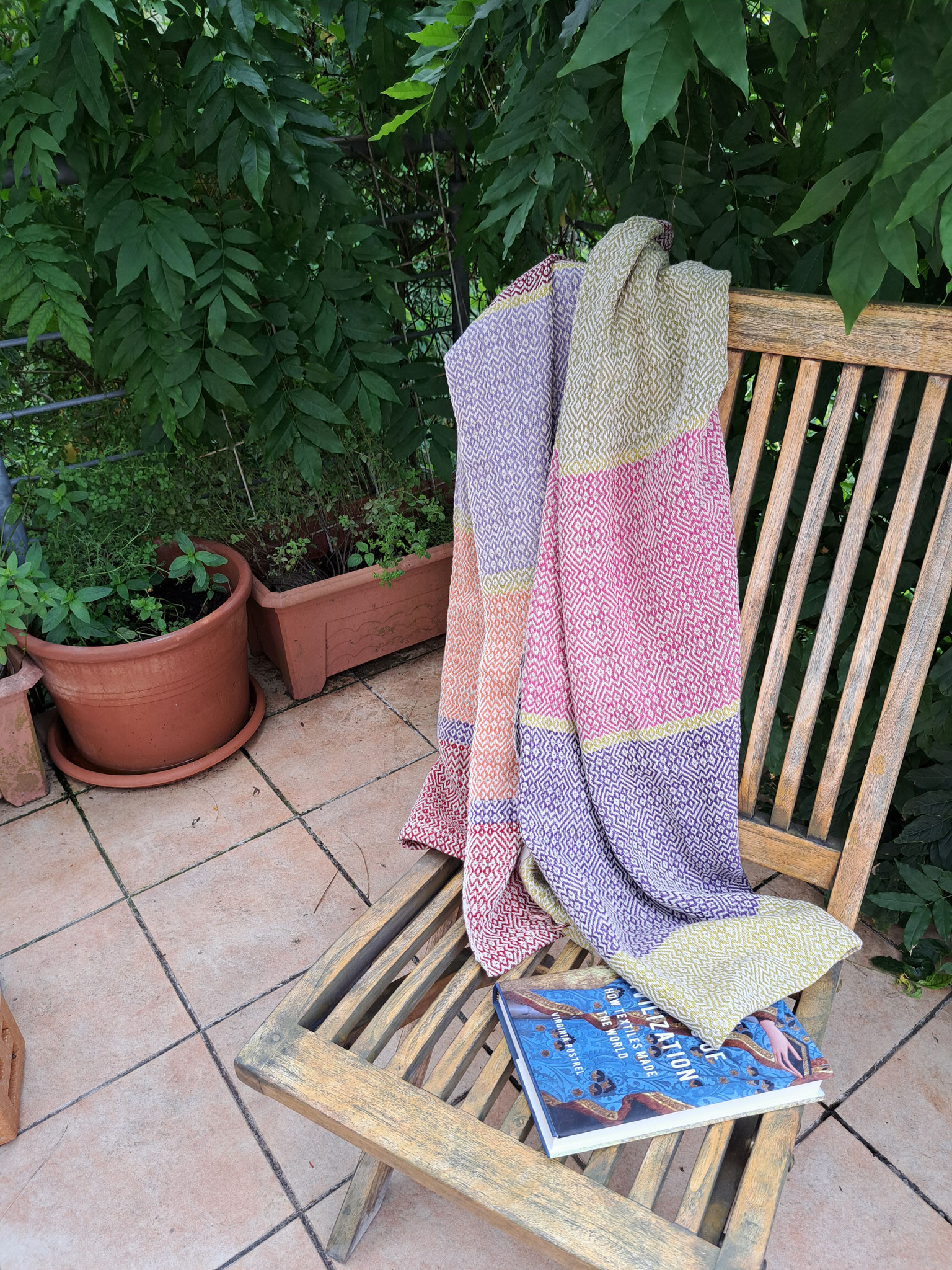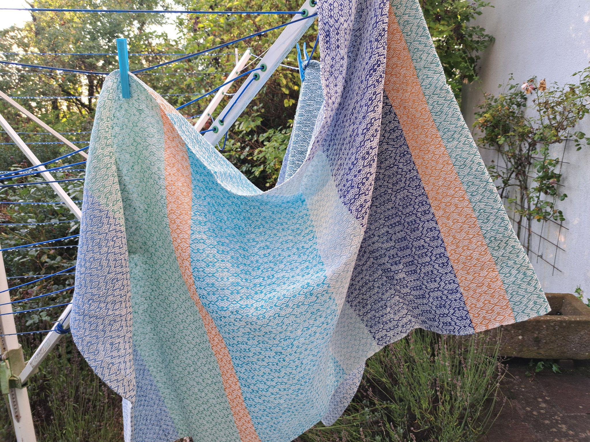 Die Tücher von oben wurdenauf Wunsch nochmal auf einer 100% Langflachs-Leinenkette nachgewebt: Auch sie sind bereits in der Maschine vorgewaschen und gehen nicht mehr ein. Aufhänger wie immer an beiden Enden, damit sie in fremden Bädern nicht auf den Boden hängen: Immerhin sind sie 2 Meter lang!