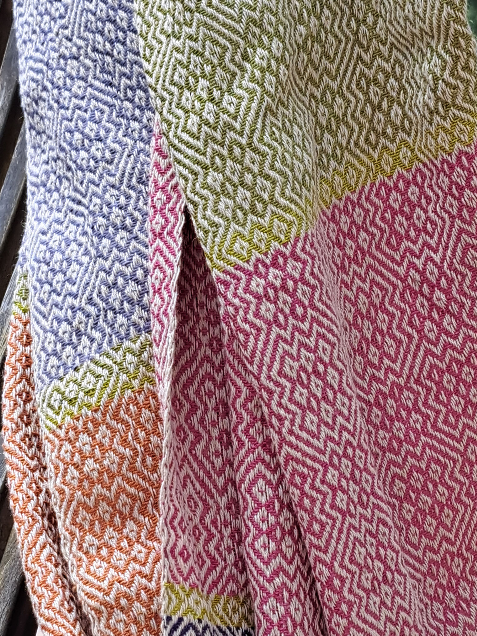 im Waffelmuster gewebt auf weißer Kette mit Schuss in hellblau, lachs, natur oder ebenfalls weiß.