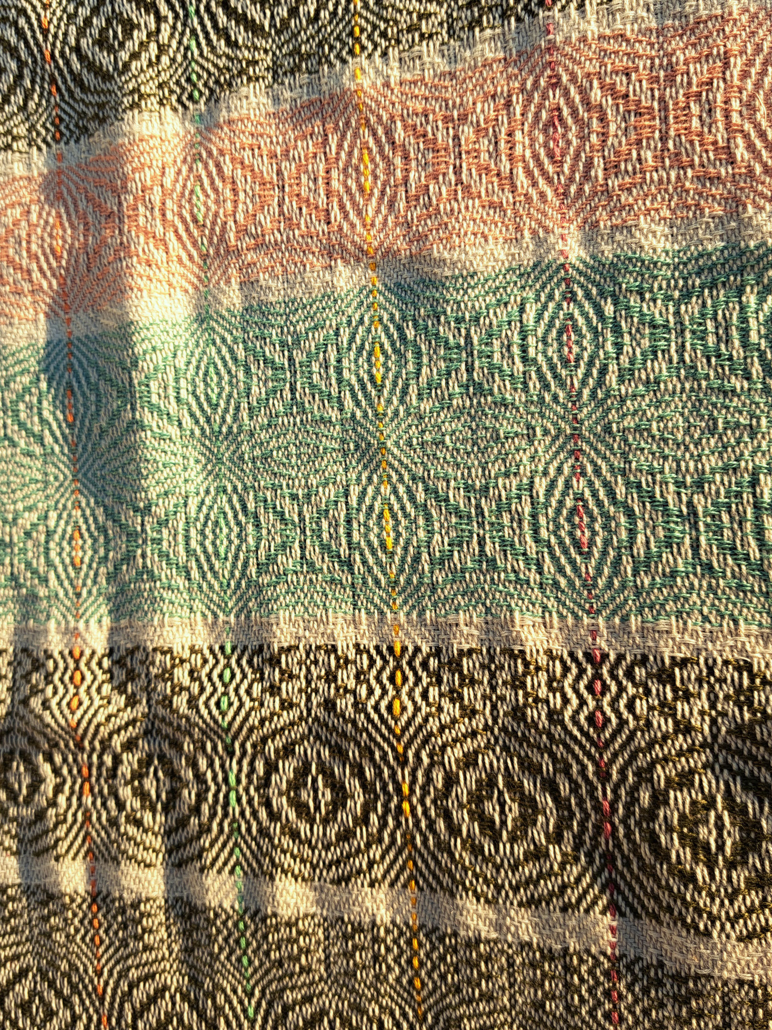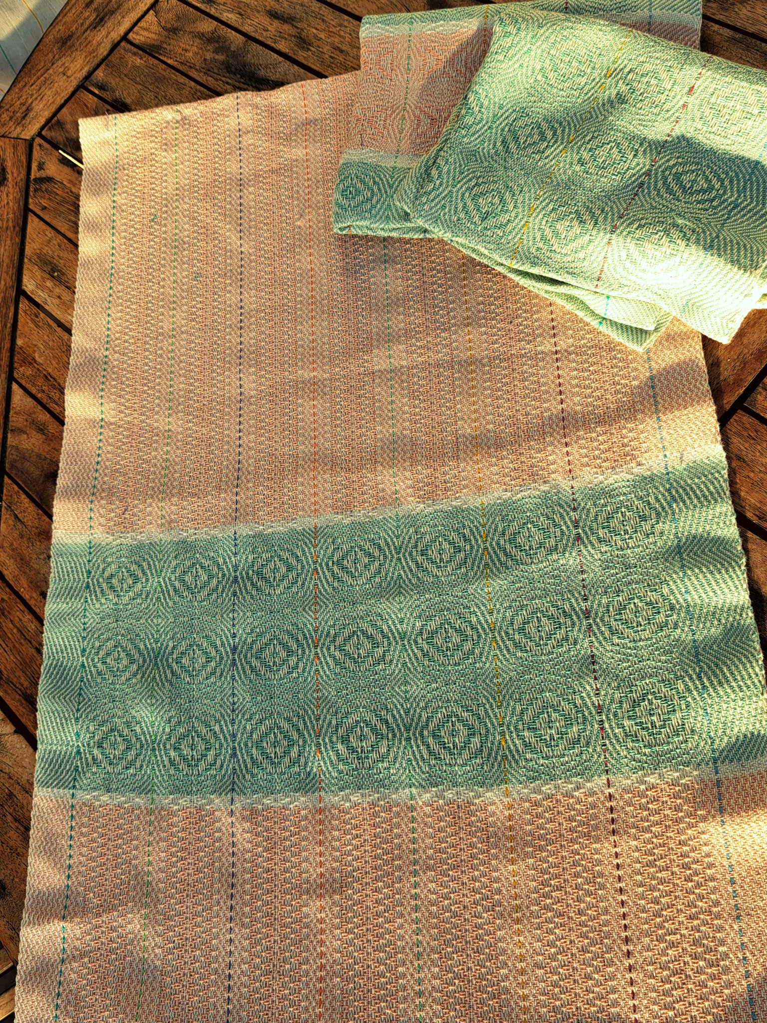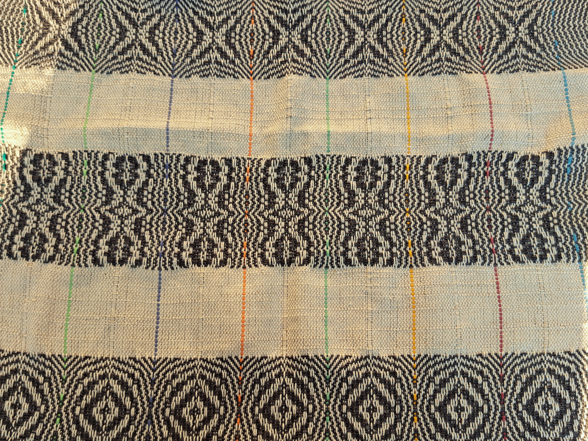 Wie so oft erfreut uns hier ein sehr altes Muster! Und mit vielen Abwandlungen entstehen mit ein bisschen Zählarbeit beim Weben wunderschöne Borten. Die Geschirrtücher sind auf Biobaumwolle mit feinen Längsstreifen mit Baumwolle im Schuß gewebt. €25,-