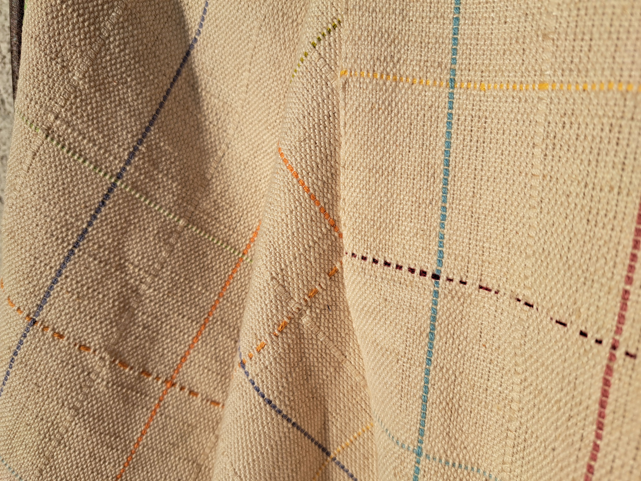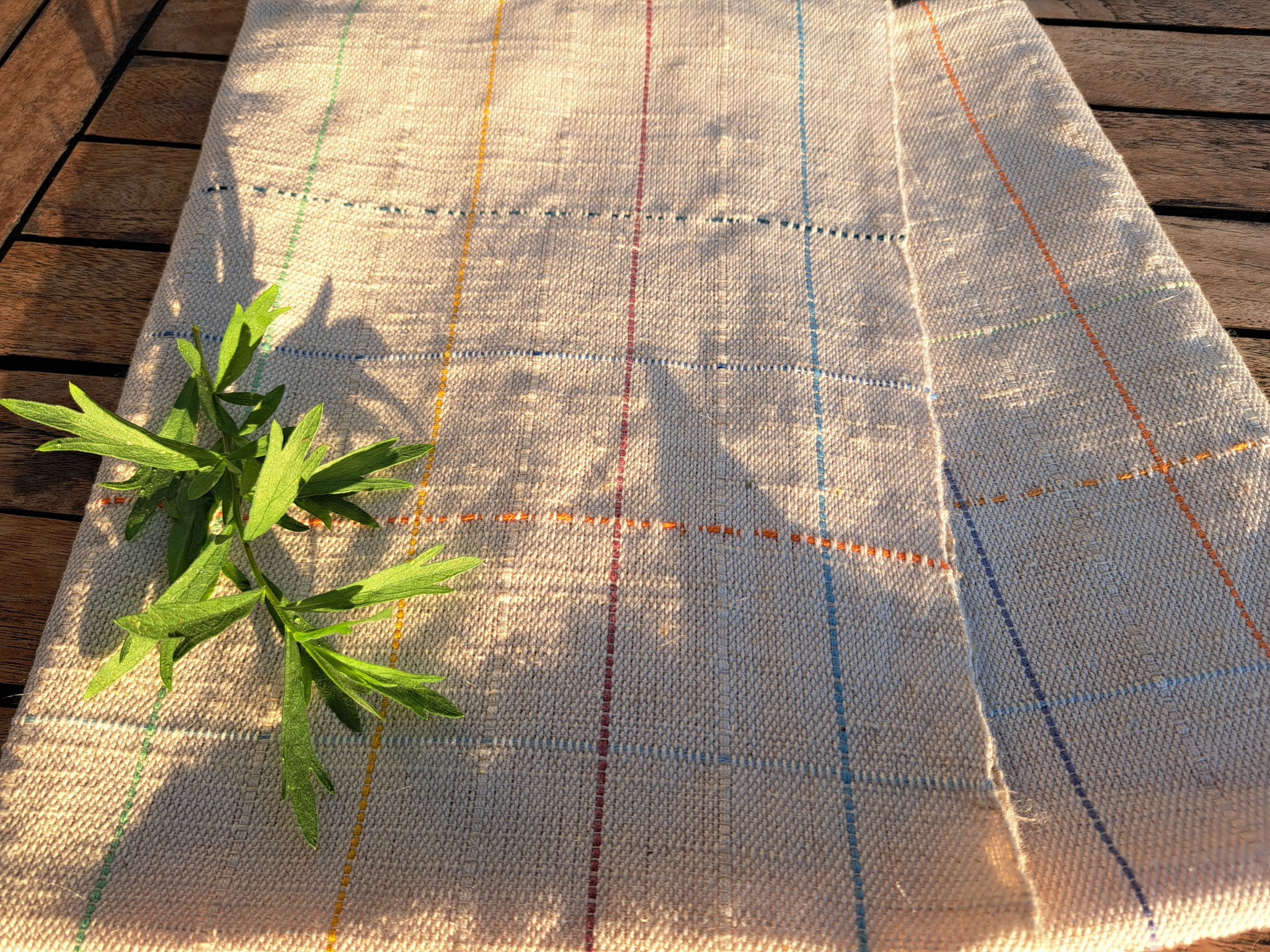 Das Naturmaterial der Zukunft ist wohl Hanf, der sogar in Deutschland angebaut und versponnen wird. Hier wurde er in ein Kette aus Biobaumwolle gewebt,