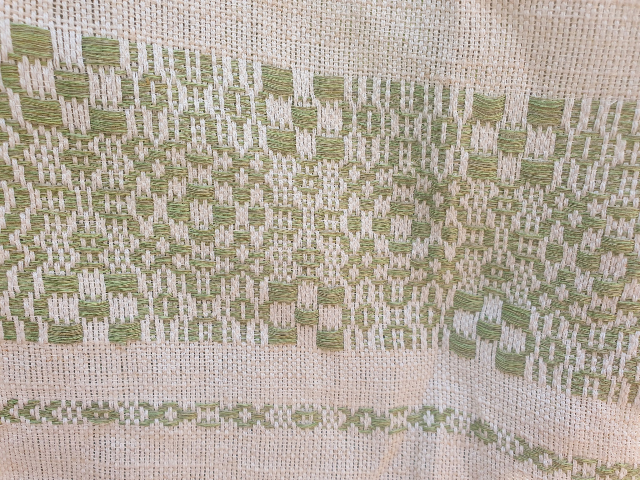 In Baumwolle (Kette) und weißem Leinen oder weißem, etwas festeren Halbleinen im Schuss. Damit Muster und Größe zueinander passen, sind die Tücher 75x45 cm groß.